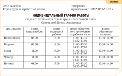 После того как вы подпишете заявление подчиненной, вам следует передать его в кадровую службу компании. На основании заявления кадровик подготовит проект изменений к трудовому договору и проект приказа, которым будет утвержден индивидуальный график работы. Давайте посмотрим, как правильно следует составить такой график.