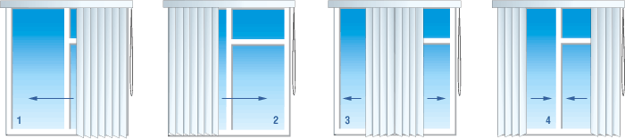 И еще один важный вопрос, с которым нужно определиться, прежде чем делать заказ, - в какую сторону будут открываться-закрываться жалюзи? Существует четыре варианта движения ламелей при закрывании жалюзи: