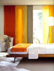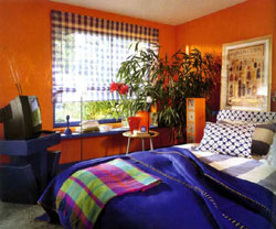 Скромное очарование клетки. В этой спальне использовано на первый взгляд пугающее сочетание цветов: оранжевые стены и васильково-синие аксессуары. И это действительно оказалось бы невыносимым, если бы не "скромная" и даже немножко строгая занавеска в сине-белую клетку. Она являет собой классическую римскую штору, поднимающуюся с помощью шнура. Конструкция проста и тем не менее вполне современна. Стилистически занавеска хорошо сочетается со многими видами декора.