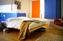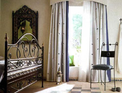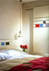 Двойственность материи. Эта спальня удивительно приветлива и уютна, поэтому так и тянет зайти в нее не только ночью, но и днем. Главный принцип оформления окна - создать необходимое для сна затемнение без ущерба для общего ансамбля интерьера. Дизайнер использовал два вида гардин: со стороны комнаты - светлые хлопчатобумажные, с необычными декоративными прорезями, с внешней стороны - более плотные, синего цвета, со светонепроницаемым покрытием. Задернув наружные шторы, можно полностью затемнить комнату. Гардинный карниз скрыт за декоративным наличником, выполненным на заказ (из ДВП толщиной 10 мм).