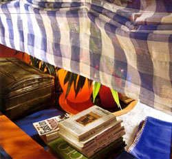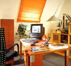 Условия диктует мансарда. Именно на наклонном мансардном окне римская штора действительно незаменима. Она не будет свисать вертикально вниз. В нашем случае ее ширина слегка превышает ширину окна, а шнуры, на которые она собирается, прикреплены к стене. Терракотовый цвет ткани придает всей комнате теплый колорит. Однако общий вид шторы достаточно строг и не располагает к расслаблению. В общем, просто находка для забравшегося на чердак трудоголика.