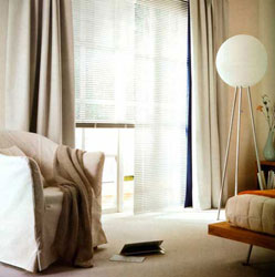 Восточный шарм. Раздвижные панели, обтянутые полупрозрачной белой тканью, привнесут в интерьер японскую (или китайскую) нотку. Панели выполняются на заказ точно под размеры окна (в данном случае - окна с балконной дверью). Горизонтальные профили из бука служат каркасом и одновременно заменяют ручки, за которые можно перемещать конструкции по направляющей. Панели спасут вас от прямых солнечных лучей. Но в комнате все равно не будет темно - полупрозрачная ткань пропускает рассеянный, более комфортный для человека свет.
