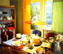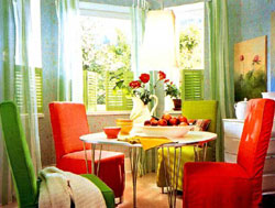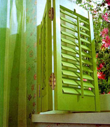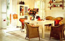 Южный флер. Двери-жалюзи (их еще называют американскими ставнями) - настоящее спасение жарким летним днем. Кроме того, с их помощью в комнате создается южное настроение. Плетеная мебель и шкаф для посуды в стиле кантри усиливают впечатление прелестного домика, находящегося где-нибудь на берегу теплого моря или среди пологих горных склонов, засаженных виноградниками. В продаже имеются ставни и двери различных цветов и размеров, готовые и на заказ. Раскладные ставни-"гармошки" - изысканная, хоть и не вполне привычная замена занавескам. Угол наклона жалюзи можно менять, соответственно меняя и угол падения проходящих сквозь них солнечных лучей.