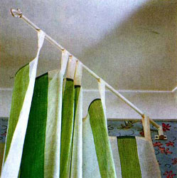 На морскую тему. Оконная мини-ширма - яркая и нестандартная декоративная деталь. Ее можно почти мгновенно развернуть и так же быстро свернуть. Хорошо, если ширма будет сочетаться с остальным убранством комнаты (с обивкой мебели, подушками или скатертью на столе). Изготавливается мини-ширма очень просто. Кусок плотной хлопковой или льняной ткани (например, в полоску) обшивают по краю. Затем на полотне застрачивают несколько вертикальных кулисок для деревянных стержней диаметром 1,6 см. Кроме них понадобятся опоры и наконечники. В данном случае для этих целей использованы деревянные полусферы диаметром 15 см и шарики-наконечники диаметром 3,5 см с отверстиями для стержней.