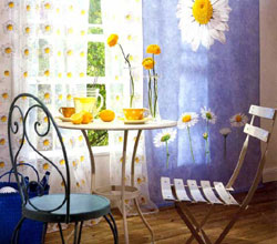 Окно в ромашках. Похоже, главным декоратором здесь было само лето. Сочетание сочных и нежных красок, романтические цветы, разбросанные по легкой полупрозрачной ткани. Графическая упорядоченность орнамента уравновешивает насыщенную колористическую гамму. Светло-голубая занавеска сделана из тонкого хлопка, а белая - из прозрачной синтетики. Первая имеет сверху застроченную кулиску для карниза, а вторая - тканевые петли.