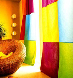 Веселые квадраты. Если у вас осталось несколько кусков разных тканей и вы не знаете, что с ними делать, предлагаем идею. Ткань нужно нарезать на квадраты одинакового размера и стачать их друг с другом по принципу техники "пэчворк". Получатся оригинальные занавески, которые можно повесить на штангу с помощью колец с зажимами. Комната повеселеет буквально на глазах. Одно условие: ткани должны иметь одинаковую либо близкую плотность, тогда шторы будут красивее драпироваться. Иногда в магазинах остатки тканей уценивают. Приобретя их, вы сможете создать новые занавески за совсем небольшие деньги.