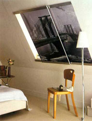 Окно-картина. Приятный сон под самой крышей: мансардное окно закрыто сдвигающимся экраном, играющим по совместительству роль картины. Конструкция выполнена на заказ из ДВП толщиной 16 мм. Экран перемещается по металлическим направляющим, прикрепленным к стене по верху и низу окна. Для декорирования можно взять любую фотографию (например, из семейного альбома) и увеличить в фотомагазине. В нашем случае использован большой постер, разрезанный пополам. Одну половину наклеили на стену рядом с окном, другую - на экран.