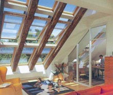 Мансардные окна, как и следует из их названия, используются в качестве светопрозрачных конструкций в мансардах. В силу необычного наклонного расположения стен в таких помещениях, окна открываются по центральной или верхней горизонтальной оси. Створка обычно фиксируется в двух положениях: либо в перевернутом - для удобства при мытье окна, либо в чуть приоткрытом, что позволяет проветривать помещение при сильном ветре, не опасаясь, что окно захлопнется. Вентиляционный клапан-форточка обеспечивает приток свежего воздуха даже тогда, когда мансардное окно закрыто. Для производства таких конструкций используют клееный брус и стеклопакеты. От природных воздействий древесину защищают пропитка и лак.