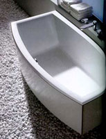 Скажем прямо - выбор есть. Хотя ванны стабильно стоят на месте, прогресс в области их удобства и дизайна идет семимильными шагами. Формы современных ванн позволяют встраивать их практически в любое пространство и поэтому свободно распоряжаться с планировками ванных комнат. Ванна может располагаться как угодно: свободно стоять посередине комнаты, примыкать к стене (к двум или трем), встраиваться в стенки, подиумы и конструкции сложных конфигураций, утопать в полу. Даже в особо сложных случаях можно подобрать вариант. Все больше поклонников завоевывают угловые ванны. Закругленные, в форме треугольника, они оставляют больше места для маневра, освобождают в комнате пространство для прохода. И до любой стенки, за которую можно держаться, рукой подать.