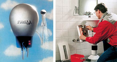 Приобрел его, кстати, тот самый мой приятель, который сделал жене такой неудачный подарок. И чтобы исправить ситуацию, он, любитель всяческих новинок, и разузнал про <Эврику>. Знакомьтесь: потребляемая мощность 2 кВт (не больше обычного электрического чайника), включается, как и все малые водонагреватели, в обычную розетку, но внутри есть небольшая емкость на 13 л воды, которую он нагревает до температуры 80°С всего за 20 минут.