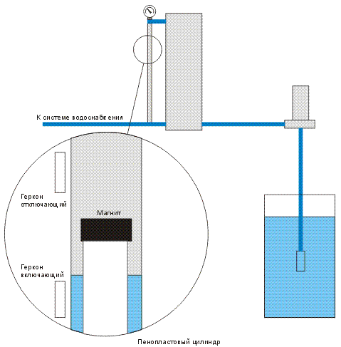 Автоматизация. Здесь чуть сложнее. Необходимо, в принципе, управлять насосом в зависимости от имеющегося давления в системе. Если давление упало до какого-то значения - включить его, и когда давление поднимется в результате работы насоса - отключить. Вот и весь принцип. Но осуществить это не так уж и просто оказалось.Можно, конечно, купить электроконтактный манометр и подключить его к системе и насосу. Для меня это оказалось дорого. Можно определенным образом переделать обычный манометр. Тоже не захотел. Слишком кропотливо и долго. И тогда я пошел по другому пути. Совсем необязательно ведь измерять давление, можно измерять уровень воды в емкости. Этот уровень изменяется в соответствии с развиваемым давлением. Я сделал еще одно отверстие в емкости, в верхней части. Между верхним и нижним отверстием подсоединил полупрозрачный кусок полиэтиленового шланга (есть такие поливочные шланги). Перед соединением бросил в него пенопластовый цилиндрик с приклеенным сверху магнитиком. Теперь при повышении уровня воды в емкости он повышается и в шланге, поднимая пенопластовый цилиндрик с магнитиком. А вот этот самый магнитик управляет прикрепленными к шлангу с наружной стороны герконами. Просто примотал их изолентой. Что такое герконы? Это герметизированные контакты, встроенные в стеклянную колбочку. Они способны замыкаться или размыкаться в зависимости от приложенного магнитного поля. Иными словами, поднялся магнитик до верхнего геркона, он сработал. Опустился магнитик до нижнего геркона, теперь сработал нижний. А герконы, в свою очередь, управляют реле, включающим насос. Если вы не электрик, то подойдите к любому из тех, кто является таковым, он вам расскажет и про герконы и схемку простейшую соберет для управления насосом.