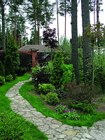 К природному камню, используемому для устройства дорожек и площадок, предъявляются повышенные требования морозостойкости и механической прочности. Этим требованиям удовлетворяют, в частности, песчаник, кварцитопесчаник, кварцит, шунгит, крупная плоская галька и, конечно же, гранит. Песчаник не боится контакта со снегом, водой, грязью и долго сохраняет первозданный вид, а разнообразные оттенки (от серо-зеленого до желтого и темно-рыжего) позволяют выкладывать из него на дорожках и площадках неповторимые рисунки. Кварцитопесчаник имеет уникальный красно-коричневый оттенок и обладает повышенной прочностью и долговечностью в наших климатических условиях. Благодаря природной шероховатости песчаников ходить по дорожкам из них в сырую погоду совсем не скользко, а в теплую и сухую – особенно приятно босиком. Гранит используется для мощения в виде пиленых плит и брусчатки – пиленой, колотой и пилено-колотой. Оттенки весьма разнообразны, от черно-серого до красноватого и серо-розового. Ну а долговечность гранита не подлежит сомнению.