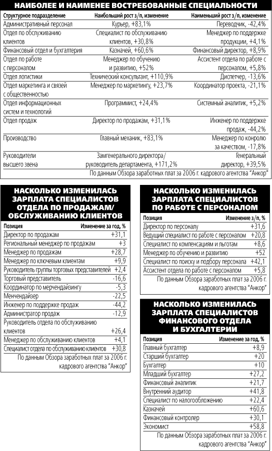 За прошлый год спрос на финансистов и бухгалтеров вырос на 80%, объясняет лидирующие позиции этой группы специалистов Виктория Простова, рекрутер финансового направления “Анкора”: “Компания становится больше, а значит, и штат финансового отдела расширяется”. Простова не исключает, что рост и спроса, и зарплат данной категории персонала предопределен модой российских компаний на IPO. На повышение цены финансиста или бухгалтера влияют завышенные требования выпускников вузов, а также привычка компаний перекупать у конкурентов работников, профессионализм которых часто не соответствует предложенной сумме, констатирует она.