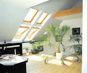 Совсем иначе выглядит интерьер в помещении с наклонными мансардными окнами. В отличие от привычного "кубического" объема, пространство под сводами крыши подчиняется наклонным плоскостям. А они - в сочетании с такими прекрасными источниками естественного света, как мансардные окна, - позволяют создавать неповторимые светоцветовые композиции, играть полутонами, используя отраженный свет.