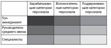 Вопрос, каким должно быть соотношение между постоянной и переменной частями компенсационного пакета, наверное, уже стал риторическим. Всемирно известные консалтинговые компании постоянно разрабатывают различные пропорции зарплаты и премии для разных категорий сотрудников, но российские топ-менеджеры и специалисты по персоналу не спешат слепо копировать существующие методики, стараясь учесть множество факторов, свойственных их организациям. Однако некоторые тенденции все же прослеживаются. Дмитрий Собокарь, консультант по C&B (Compensations & Benefits) компании AXES Management, приводит таблицу, иллюстрирующую предполагаемые соотношения: чем темнее секция, тем большая доля компенсационного пакета является переменной.
