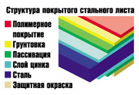 Металлопластик представляет собой многослойный материал, основу которого составляет оцинкованный стальной лист. На цинк с обеих сторон химическим путем наносится тонкий и рыхлый слой пассивации, обеспечивающий устойчивое соединение грунтовки и цинка. На грунтовку наносится слой полимера, а с обратной стороны - защитная краска (см. рис.).