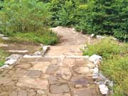 Наиболее выигрышно будут смотреться дорожки из колотого и плиточного натурального камня. Помимо бесспорных декоративных достоинств, такое мощение отличается долговечностью, всегда остается сухим и чистым. Соответственно, и расценки на него достаточно высоки. Камень обычно используют для дорожек, ведущих к дому. Плиты из колотого материала дешевле плит правильной формы, к тому же они отличаются по цвету, поэтому их легче подобрать к любой отделке дома. Укладку каменными плитами и колотым камнем выполняют разными способами, в частности на песок или слой цементного раствора. Привлекательность таких дорожек заключается не только в декоративности самого природного камня, но и в рисунке, который складывается из разных по размеру и форме плит и кусочков.