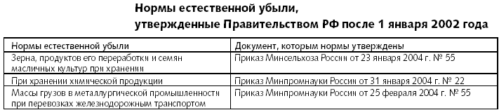 Потери от недостачи и (или) порчи товарно-материальных ценностей при транспортировке и хранении можно включить в расходы при расчете налога на прибыль (подп. 2 п. 7 ст. 254 Налогового кодекса РФ). Но только если эта сумма соответствует нормам естественной убыли, утвержденным в Порядке, установленном постановлением Правительства РФ от 12 ноября 2002 г. № 814. Разрабатывать эти нормы должны министерства и ведомства. Причем сделать это они должны были до 1 января 2003 года. Однако на сегодняшний день вступили в силу только нормы, приведенные в таблице.