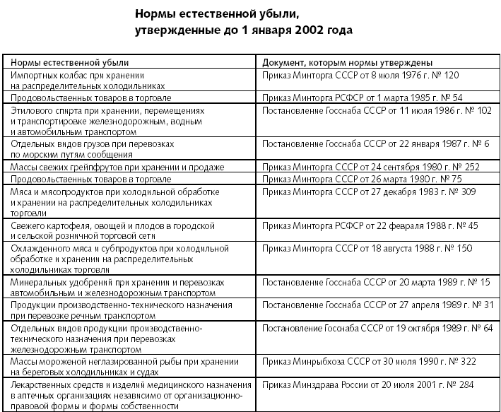 Однако все еще не отменены нормы естественной убыли ТМЦ, которые были утверждены до вступления в силу главы 25 Налогового кодекса РФ. Примеры приведены в таблице.