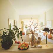Прежде всего необходимо расстаться с лишними коридорами и внутренними стенами. Жизнь в полностью открытом пространстве способен выдержать не всякий, поэтому помещения в будущей студии изолируются друг от друга, но не глухими стенами, а "намеками" на них. Правда, как показывает опыт, чаще всего недостаточно отделить гостиную от кухни лишь "психологически" - барной стойкой или низкой открытой витриной. Ведь именно общее пространство, а точнее, общая атмосфера - основной минус объединенных помещений. Когда стен нет, запахи расползаются по всему жилью. Пожалуй, самое удачное решение - компромиссное: убирающаяся перегородка. Она может быть полупрозрачной, бамбуковой. Гостиную и кухню можно разделить перегородкой из матового стекла. Свет легко пройдет через нее, рассеиваясь в помещении и отражаясь от металлических деталей.