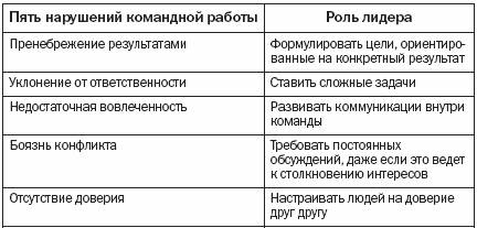 Патрик Ленсиони (Patrick M. Lencioni), президент консалтинговой компании The Table Group (Сан-Франциско), выделяет 5 наиболее распространенных нарушений в работе команды и выделяет роль лидера в каждом из таких случаев.