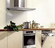 Настенные и потолочные вытяжки считаются уже самостоятельными предметами кухонного интерьера. Настенные бывают в виде изогнутого прямоугольного козырька, камина или прямоугольного козырька с выдвижным экраном, в котором находится фильтрующий элемент. Потолочные вытяжки называют «островными», поскольку они вывешиваются над плитой, установленной на некотором расстоянии от стены, и визуально связка «плита–вытяжка» как бы образует остров. Естественно, что настенные и потолочные вытяжки оказываются на самом видном месте на кухне, во многом определяя эстетику ее интерьера. Наиболее эффективный и броский проект кухни можно разработать, используя «островной» вариант, но он, к сожалению, подходит лишь для очень просторной кухни.