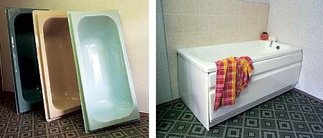 Акриловые вкладыши изготавливают по индивидуальному заказу – любого цвета и даже формы По желанию можно закрыть «новую акриловую» ванну такими панелями (справа)