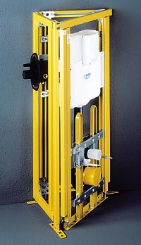 Модель для несущей стены у «Геберита» называется «Геберит комбификс», «Гроэ» (Grohe) ее именует «Даль Унисет». (Розничная цена модели «Даль Унисет» 160$). Это непосредственно монтажная рама, в которую вмонтирован бачок. Она может быть прикреплена к стене только из полнотелого кирпича или крепкого бетона (ни в коем случае не из пенобетона или гипсокартона). Нижнюю часть конструкции для большей прочности обкладывают кирпичами и уже потом «зашивают» гипсокартоном и сверху – плиткой. После завершения всех монтажных работ на торчащие из стены штыри рамы вешается унитаз. Кстати, чтобы унитаз давил не на плитку (иначе он ее когда-нибудь проломит), под рамы «Комбификс» или «Даль Унисет» делают закладку из какого-то стенового материала. И только потом на него можно наклеивать плитку.