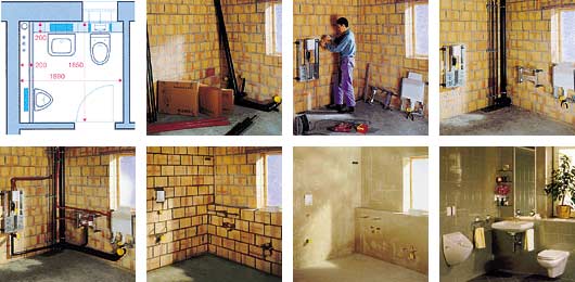 У фирмы «Геберит» есть система «Геберит гис», которая также позволяет (как одна из модификаций «Даль Рапид С») использовать по максимуму пространство санузла. Из специальных профилей и креплений можно сделать несущую стену, которая выдержит любую керамику и в любом количестве. А еще у «Геберита» есть модель, которая называется «Геберит санблок». Это встроенный бачок, который уже «зашит» стеновыми панелями. Такая модель вполне может называться «санузел под ключ». Правда, предназначена эта модель, скорее, для европейских стран, где рабочий час мастера стоит 80 марок.