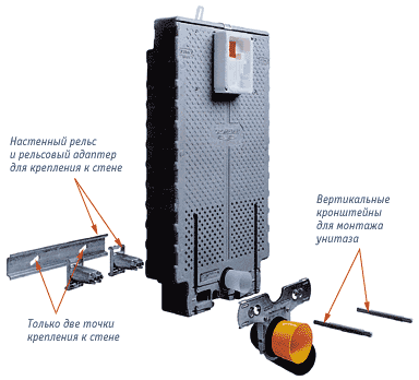 В комплект моделей «Геберит комбификс» и «Даль Унисет» входят «шпильки» (длинные штыри) для крепления унитаза (или писсуара), гайки, декоративные колпачки и отводной патрубок, подающий воду. Правда, модели двух крупнейших производителей («Геберит» и «Гроэ») все же кое в чем отличаются. Бачок модели «Даль Унисет» заключен в дополнительную пенопластовую «скорлупу». Специалисты «Гроэ» утверждают, что это создает повышенную звукоизоляцию. Хорошее приспособление: в такой унитаз можно смело лить воду, не боясь среди ночи разбудить всех домочадцев и соседей.