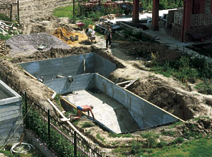 Бетон заливают в подготовленный котлован с фундаментом и арматурой - это стены и дно бассейна. Важно, чтобы чаша заливалась сразу, а не частями. Бассейн, сделанный из нескольких слоев, очень ненадежен. Перед застыванием бетона необходимо <выбить> из него воздушные пузырьки. Это делается с помощью специальных вибрирующих молоточков.