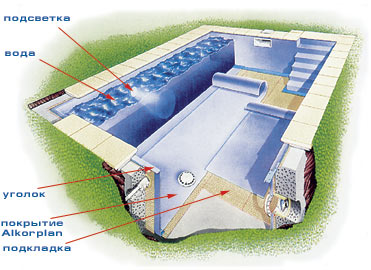 Вариант облицовки внутренней части стационарных бассейнов с помощью материала Alkorplan (одновременно он является и гидроизолятором)