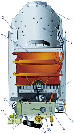 К железному коробу (собственно колонке), который висит в квартире, подходят две трубы. По одной течет холодная вода, по другой - газ. В нижней части этой конструкции находятся основная и запальная горелки. Запальная работает как зажигалка. Вы открываете кран с водой, после этого открывается газовый клапан и <пускает> газ в основную горелку. Он загорается от <запальника>. Газ горит, выделяемое тепло нагревает воду. Вода течет по изогнутой спиралью трубе (теплообменнику). Продукты горения газа удаляются через дымоход, расположенный в верхней части короба, а труба, уже с горячей водой, идет к раковине, ванной и на кухню.