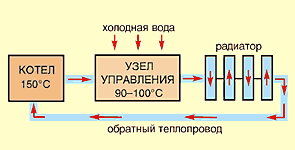 Зависимая система наиболее распространена. Нагретая до 150°С в котле вода поступает к узлу управления, где после подмешивания холодной воды общая ее температура падает до 90-100°С, а затем попадает в радиаторы помещений. После этого потерявшая температуру вода попадает в обратный теплопровод и поступает снова в котел для повторного нагрева.