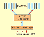 Независимая система. Теплоноситель (горячая вода) поступает в водонагреватель, где температура горячей воды используется для нагрева воды в системе отопления здания. При этом поступающий от котла теплоноситель (горячая вода t = 150°C) и вода в системе отопления (t = 90-100°C) изолированы друг от друга.