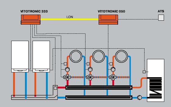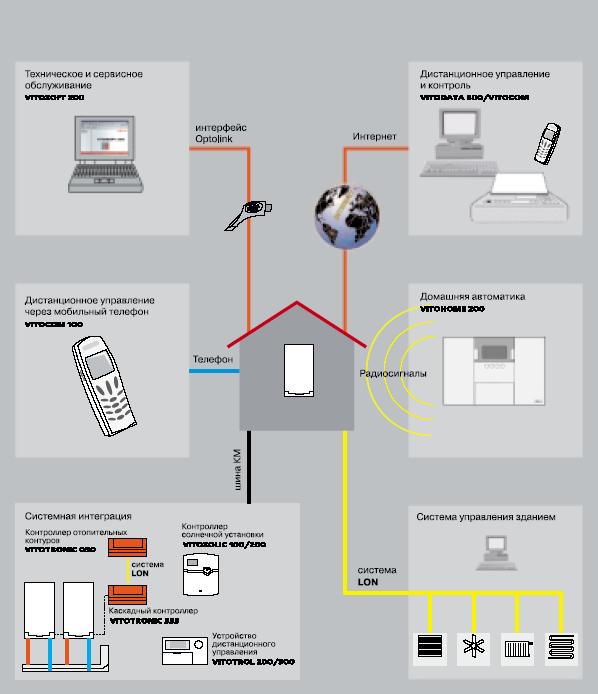 Новая программа настенных термоблоков подходит для встраивания во внутренние и внешние системы связи. Это и привлекательный в ценовом отношении дистанционный контроль настенных модулей в одноквартирных и двухквартирных домах по телефону с помощью Vitocom 100, и присоединение с системами LON или EIB, а также дистанционное управление и контроль с помощью системы интернет-телеконтроля Vitodata 300.
