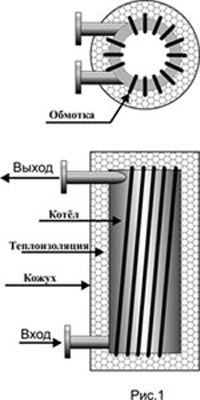 Создание индукционного котла, работающего на токах высокой частоты от преобразователя, позволило многократно снизить его габариты и вес. Для получения максимально возможного КПД и сведения магнитных полей вокруг котла к минимуму было решено применить тороидальную обмотку, намотанную на корпус котла, выполненного из двух вваренных одна в другую труб (рис. 1).