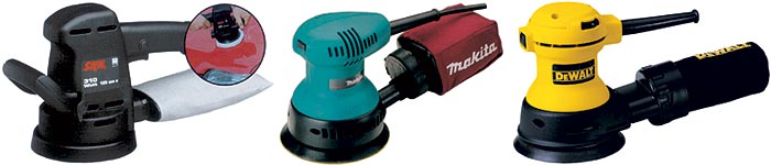 Для начала упомянем еще один вид - орбитальные шлифовальные машины. В принципе они используются редко. Но сказать хотя бы пару слов надо, чтобы стало понятнее, как работают эксцентриковые шлифователи. Из названия <орбитальные> следует, что круглая <шкурка> вращается вокруг собственной оси. Но опыт показывает: это неэффективно. Гораздо удобнее пользоваться эксцентриковыми шлифователями, в которых, кроме вращательных движений, <шкурка> совершает еще и колебательные. Кстати, такую шлифмашину можно использовать не только для шлифовки, но и для полирования мебели или даже автомашины. Достаточно вместо <шкурки> установить специальную насадку из мягкой шерсти - и обрабатываемая поверхность заблестит как новая. На самом деле, сфера деятельности эксцентрикового шлифователя обширна: шлифование и полировка дерева, металла, пластмассы, шпатлевки и лака - на прямых и вогнутых поверхностях. Можно легко обработать края, например, какой-нибудь тумбочки или дверного блока. Эксцентриковые шлифователи довольно популярны, и фирмы-производители предлагают нам довольно богатый выбор моделей. Вот некоторые из них.