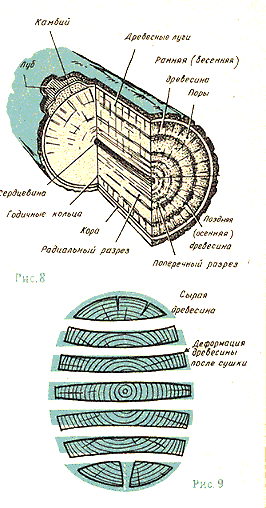 Домашний мастер должен знать структуру и строение ствола дерева (рис. 8) и ясно представлять себе процесс высыхания древесины. На рис. 9 показано, как в результате высыхания меняется форма брусков и досок, выпиленных из ствола дерева. Необходимо иметь в виду, что объем влажной древесины после высыхания уменьшается, поэтому все элементы сделанных из дерева предметов должны быть точно подогнаны друг к другу. Примером увеличения объема древесины от насыщения ее водой является разбухание досок наполненной водой бочки. Разбухая, доски плотно прилегают одна к другой, и бочка не пропускает воду.