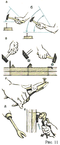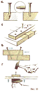 Одной из наиболее часто встречающихся при работе с древесиной и, казалось бы, самых простых операций является забивание гвоздей. Но и эта операция требует определенных знаний и навыков. Например, чтобы вбить гвоздь в легко растрескивающееся дерево, нужно откусить клещами острие гвоздя или затупить его ударами молотка. Такой гвоздь не расколет древесину (рис. 10, а).