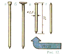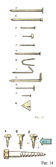 Строительные гвозди (рис. 13, е) выполняют с насечкой на стержне, благодаря которой они лучше удерживаются в древесине. Такие гвозди используются для сколачивания дверных и оконных коробок. Шляпка строительного, как и плотницкого, гвоздя полностью входит в древесину.