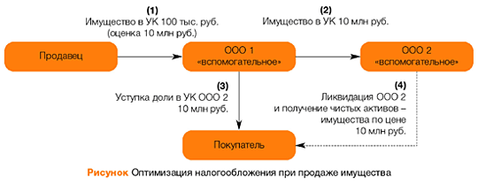 Основное средство переоценивалось, а затем вносилось в уставный капитал «вспомогательного» общества с ограниченной ответственностью. Получаемая при переоценке разница между стоимостью вносимого имущества и номинальной стоимостью приобретаемых долей не являлась прибылью налогоплательщика. В налоговом учете «вспомогательного» общества стоимость внесенного в уставный капитал имущества отражалась по остаточной стоимости, то есть с учетом переоценки. Затем доля в уставном капитале «вспомогательного» ООО продавалась конечному покупателю, который получал право собственности на имущество. При этом налоговых последствий по НДС и налогу на прибыль не возникало.