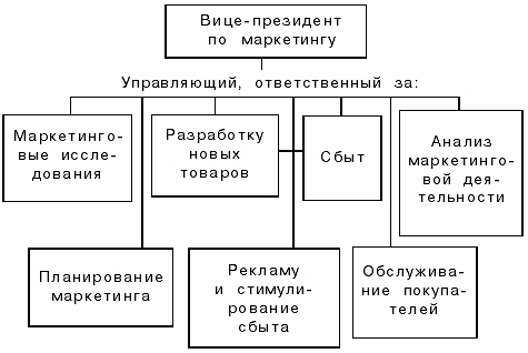 Для предприятий, деятельность которых осуществляется одновременно на нескольких рынках в различных регионах страны, особенно если эти предприятия выпускают однотипную продукцию, возможна дальнейшая дифференциация задач маркетинговых служб применительно к отдельным рынкам (назначаются лица, несущие ответственность за маркетинговую деятельность в целом на отдельных рынках).
