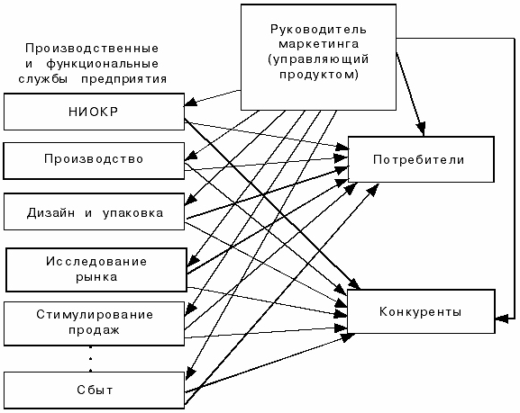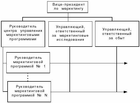 Руководителю (проекта) программы, например, по освоению какого-то рынка определенной продукции передаются от руководства предприятия необходимые полномочия по распределению ресурсов, а также исполнению мероприятий, составляющих программу. Руководителю маркетинговой программы временно подчиняются не только сотрудники соответствующих маркетинговых служб, но также и сотрудники подразделений, занимающихся разработкой и доведением до производства соответствующего продукта (на рисунке 4 это показано стрелками, выходящими за пределы рисунка). Таким образом, каждый участник работ по программе, находясь в штатном расписании соответствующего подразделения, имеет двойное подчинение: по линии программных работ он подчиняется руководителю маркетинговой программы, во всех остальных отношениях — своему линейному руководителю.
