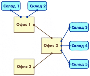 В одной конфигурации может быть создано несколько независимых схем обмена с различными информационными системами. При организации схемы обмена не накладывается ограничений на структуру распределенной системы. Может быть организована как классическая структура типа «звезда», так и более сложные многоуровневые структуры типа «снежинка» и другие.