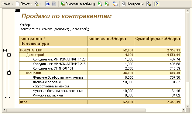 В отчетах, реализованных с помощью построителя отчета, пользователь может самостоятельно производить все необходимые настройки и получать необходимую итоговую информацию.