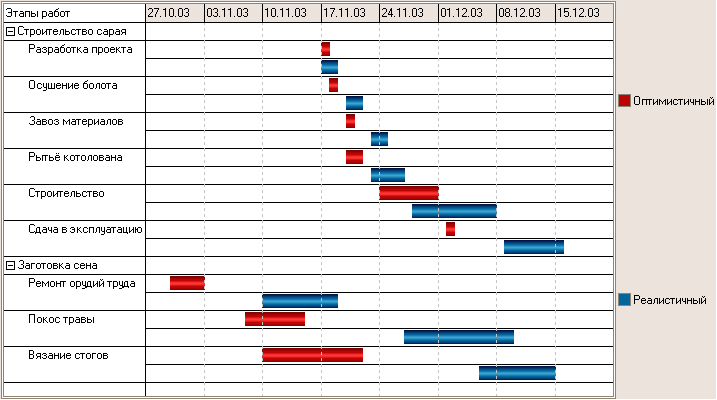 В типичной диаграмме Ганта отдельные задачи и операции проекта перечислены с левой стороны диа-граммы, шкала времени отображается сверху, а длительности каждой задачи и операции показаны горизонтальными полосками (лентами) от даты начала до даты завершения.