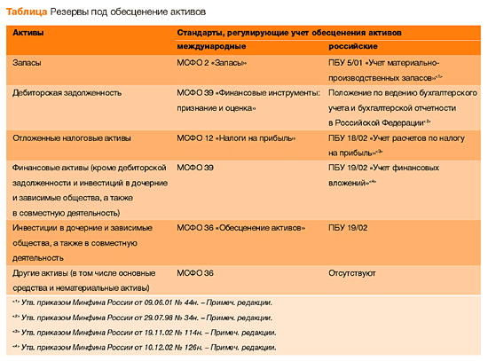 Порядок отражения в отчетности обесценения активов регулируется различными МСФО в зависимости от вида активов (см. таблицу). Российские правила бухгалтерского учета обязывают отражать обесценение лишь некоторых видов активов, в частности запасов, дебиторской задолженности, финансовых вложений и отложенных налоговых активов. А вот порядок отражения других активов, например основных средств и нематериальных активов, российскими ПБУ пока не определен2.