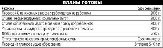 Готовиться к неприятным новостям следует не только состоятельным гражданам. Кремль давно настаивает на отмене так называемых нефинансируемых мандатов, или обязательств, которые возложены на казну оппозиционным исполнительной власти парламентом в 90-е гг. Многие из них из года в год не исполнялись вовсе (перечень обязательств, не подлежащих исполнению, ежегодно принимался в виде приложения к федеральному бюджету) или исполнялись не полностью, что вызывало протесты и судебные иски со стороны ветеранов, инвалидов, чернобыльцев. Объем нефинансируемых обязательств консолидированного бюджета, по оценке Минфина, составляет 2,5 трлн руб. в год.