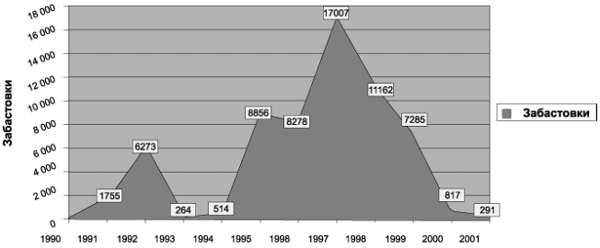 Сокращение количества трудовых дел в судах за 1997—2001 гг. коррелируется с общей для страны тенденцией по снижению социальной напряженности в эти годы. Этот процесс наглядно иллюстрируется графиком забастовок, проведенных в 1990—2001 гг: